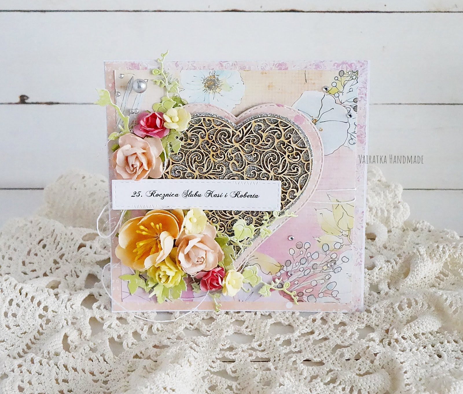 Dziś kartka z okazji 25. rocznicy ślubu - czyli srebrnego wesela :) Stąd pod pięknym ażurowym sercem mieniący się brokatowy srebrny papier. Całość w delikatnych pastelowych kolorach na bazie Pastel Garden.